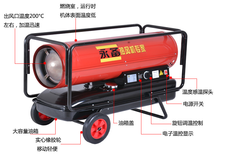永備燃油熱風機以其卓越的加熱效率著稱。燃油在燃燒室內充分燃燒,釋放出巨大的熱能,這些熱能通過高效的熱交換系統迅速轉化為熱風,并在短時間內向周圍環境擴散。無論是在寬敞的工廠車間、大型倉庫,還是開闊的戶外活動場所,永備燃油熱風機都能迅速發揮作用,快速提升環境溫度,驅散寒冷。